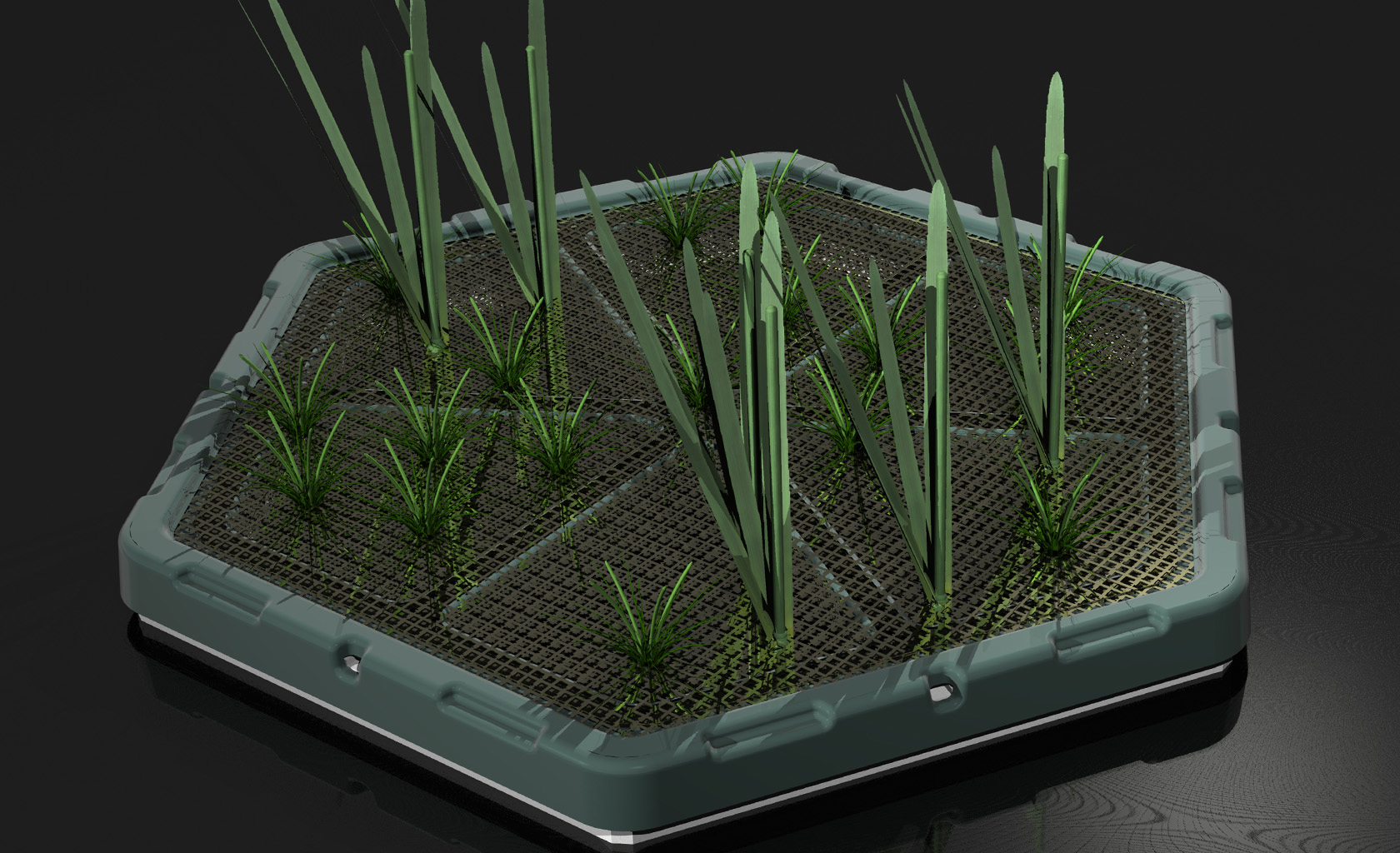 Low cost hydroponics element for modular and custom configuration of the Floating Island used for bio-purification of the storm and mine waste water ponds. Design for scalable and on demand production with minimal capital cost investment.