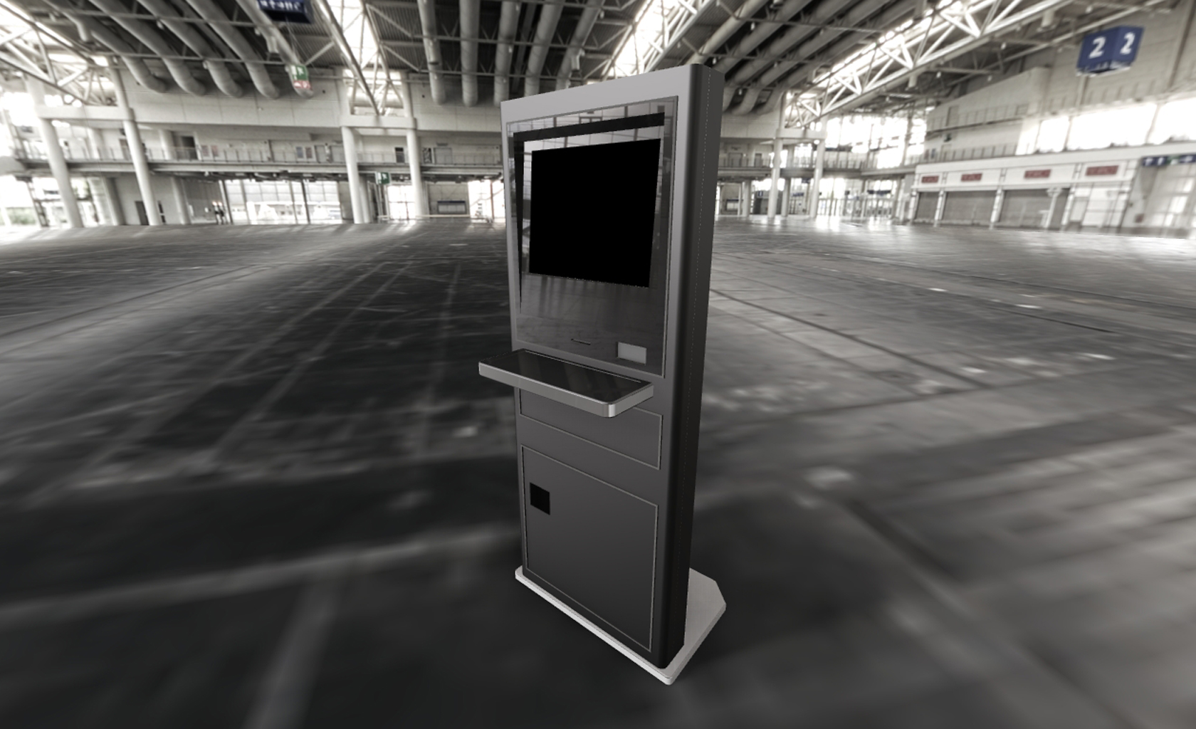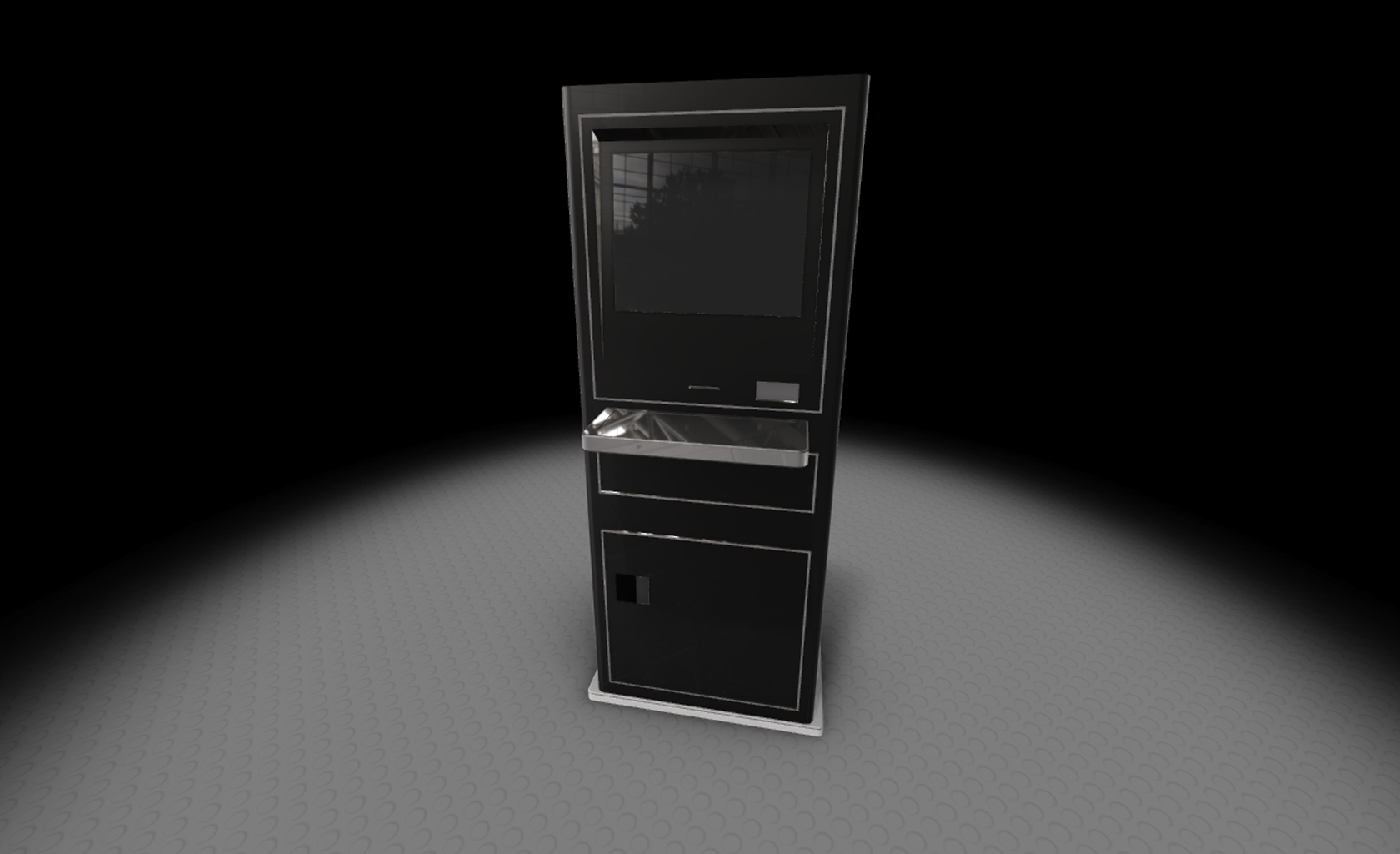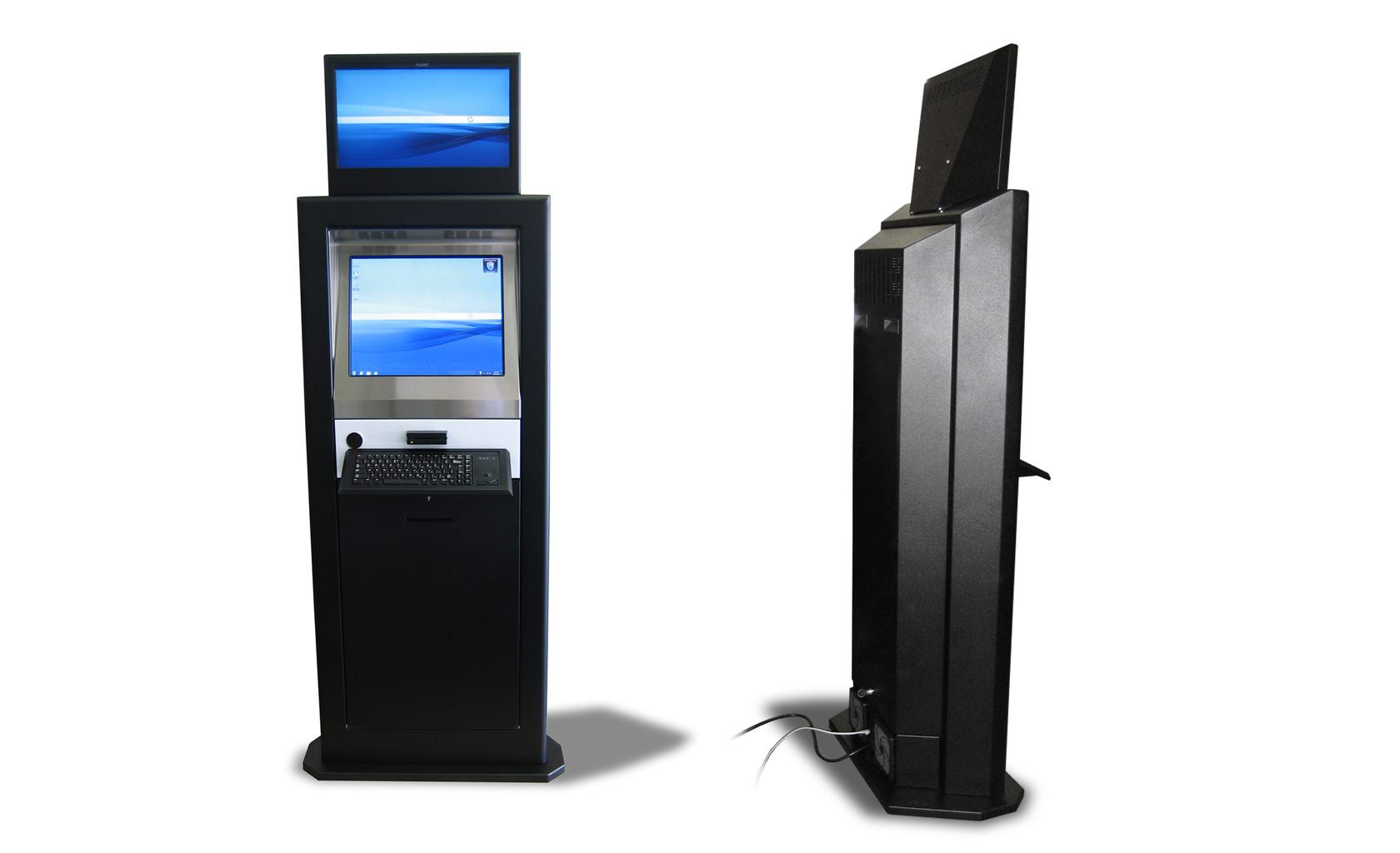 Custom design Kiosk for niche market segment complying to American with Disabilities Act. Ruggedized and modular design allowing several models with same core, covering optional keyboard, touch screen, bill & coin dispenser, credit card reader and printers.