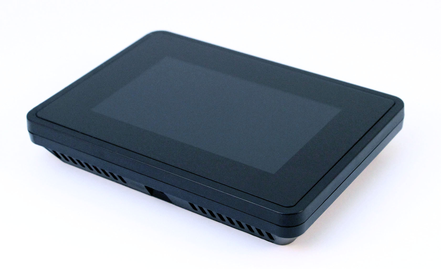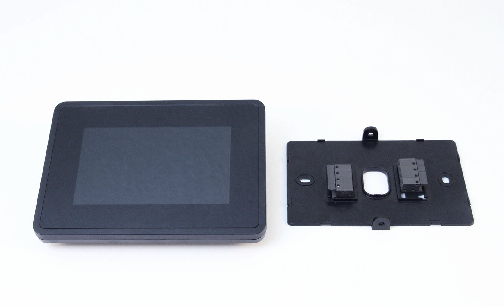 Thermostat and hospitality device used in hotels designed for high and low voltage service elevates the hotel service and customer convenience to new standard. Design in view of very low cost production and tooling while still having full size Touch screen , e-ink display and for easy installation.