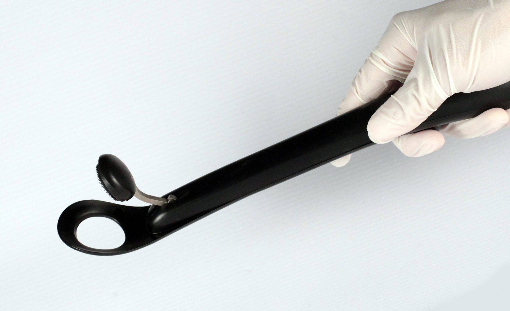 Sampling tool used at airports in conjunction with detection instrument is designed for continuous single hand operation. Ergonomic design prevents strain even with extensive use. Mechanism for hammer auto locking when in closed position. Design for medium size production, dish-washer safe and with replaceable 'Velcro' tip pads.